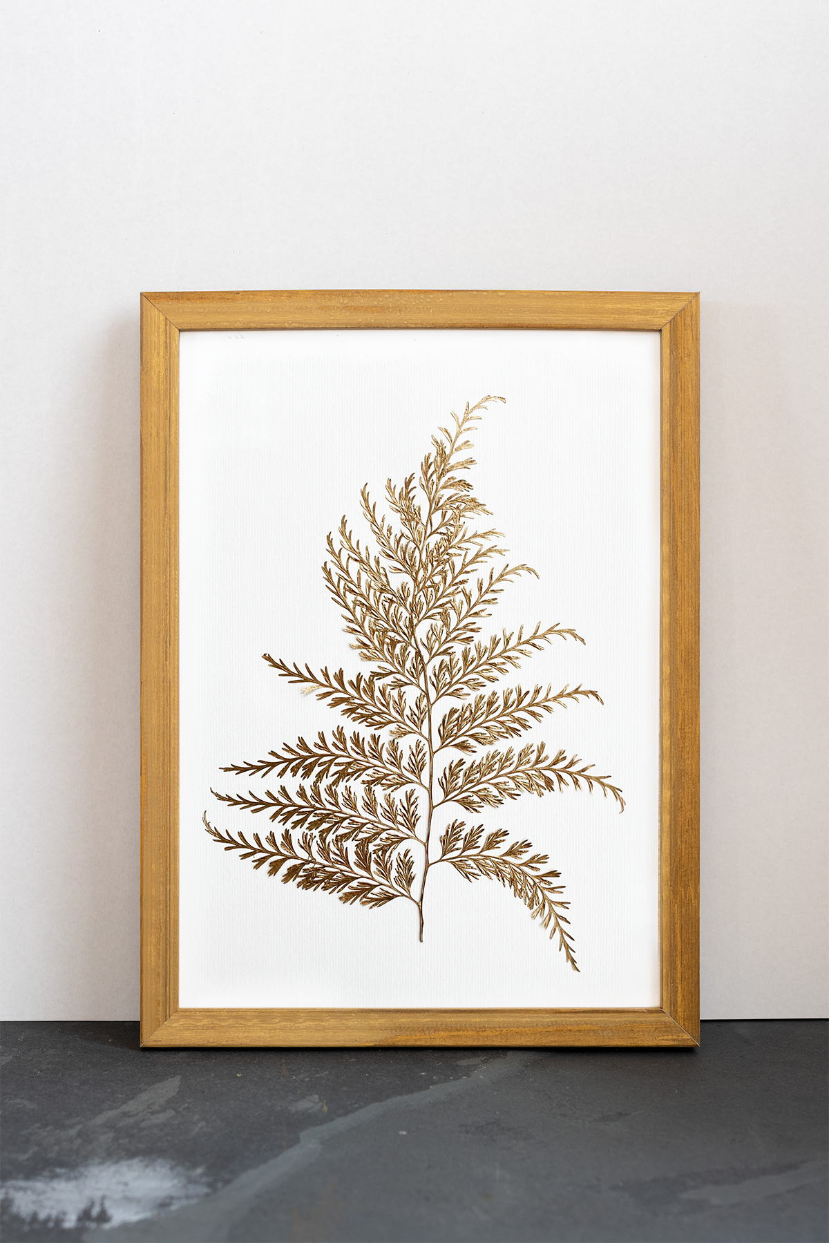 Cuadros con helechos prensados, 100% naturales, y pintados en dorado sobre fondo de papel negro o blanco, o de lino beige o crudo.